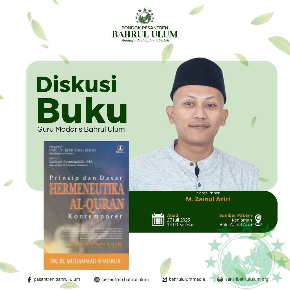 Diskusi buku guru Madaris Bahrul Ulum akan dilaksanakan pada Ahad 27 Juli 2025 jam 14:00-selesai, mendiskusikan buku al-Kitab wa al-Quran: Qirah Muasirah (Prinsip dan Dasar Hermeneutika al-Quran Kontemporer). Buku ini membahas secara mendalam metode penafsiran Alquran yang dikembangkan oleh Muh