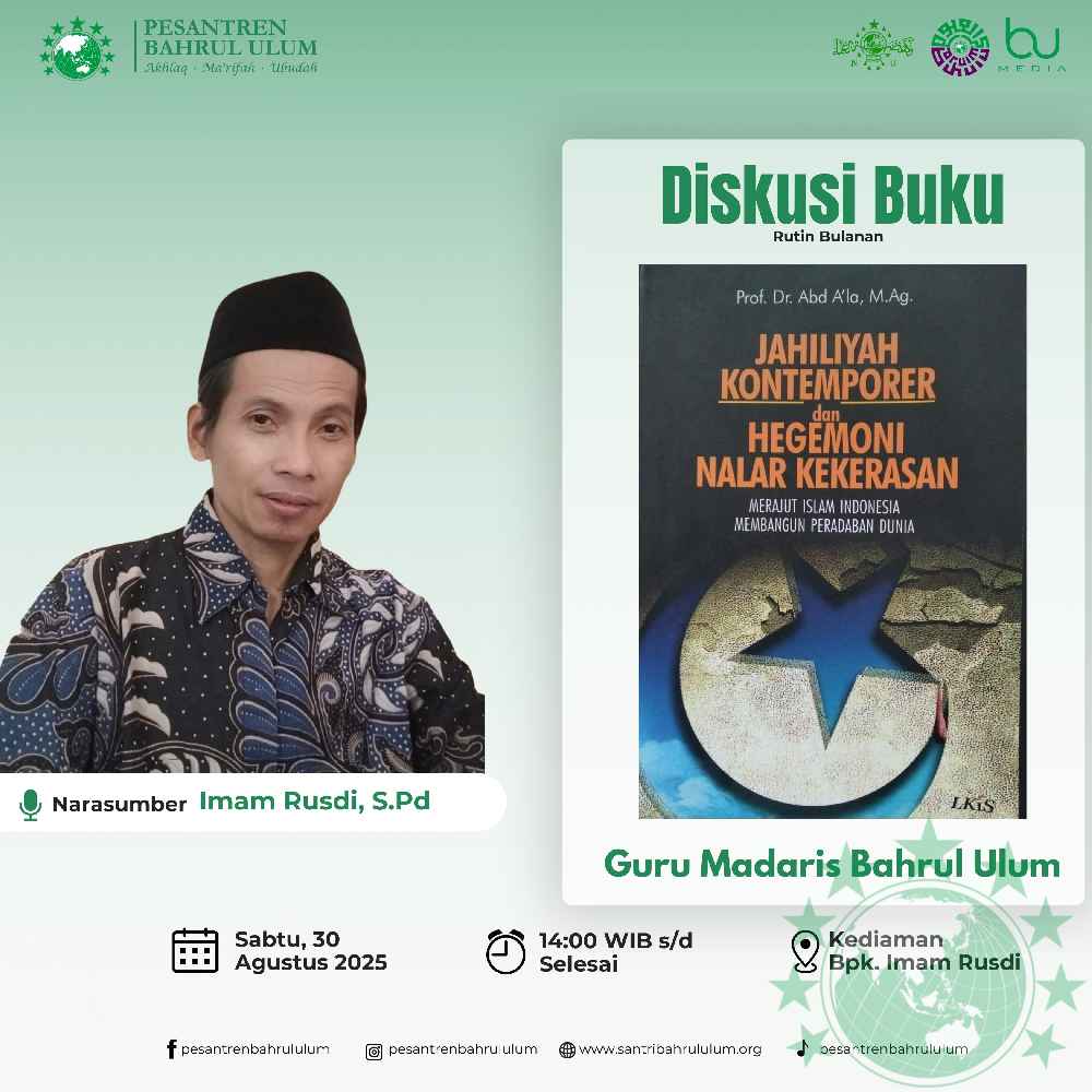 Diskusi buku guru Madaris Bahrul Ulum akan dilaksanakan pada Sabtu 30 Agustus 2025 jam 14:00-selesai, mendiskusikan buku Jahiliyah Kontemporer dan Hegemoni Nalar Kekerasan: Merajut Islam Indonesia, Membangun Peradaban Dunia. Buku ini mengajak pembaca untuk memahami akar munculnya dan berkembang